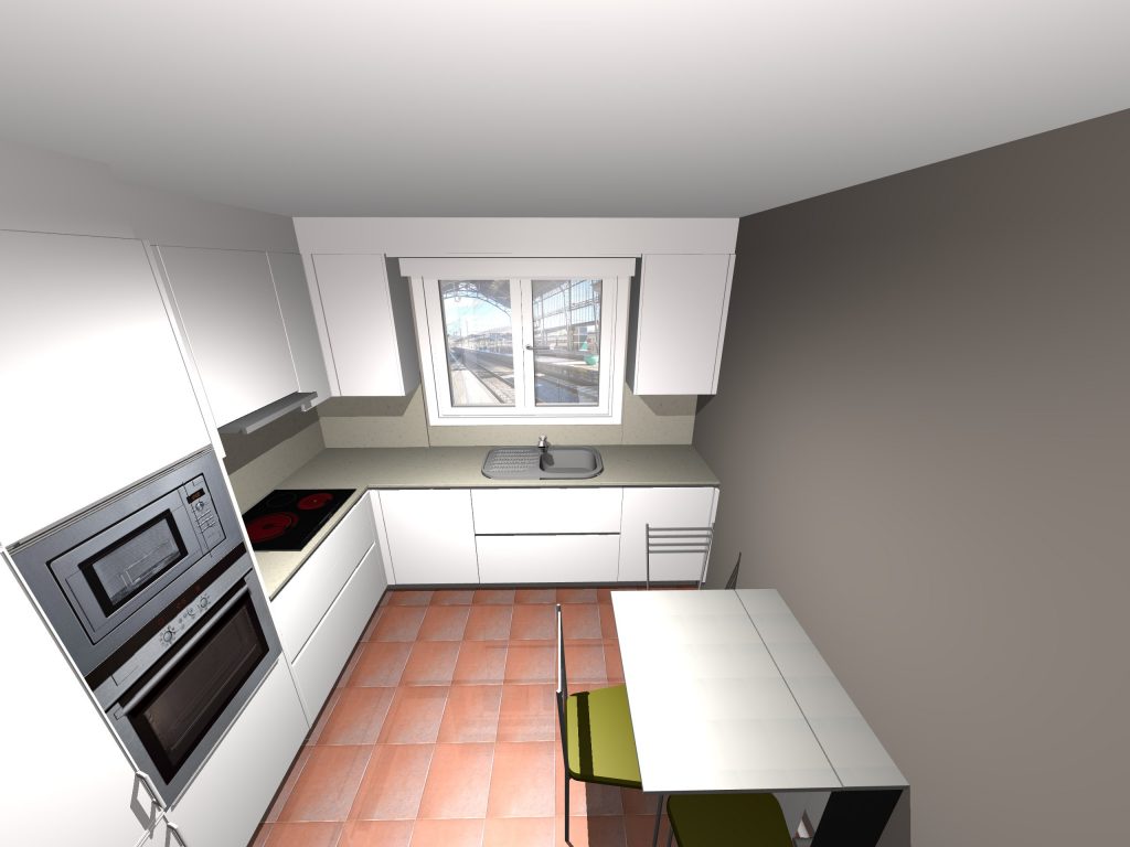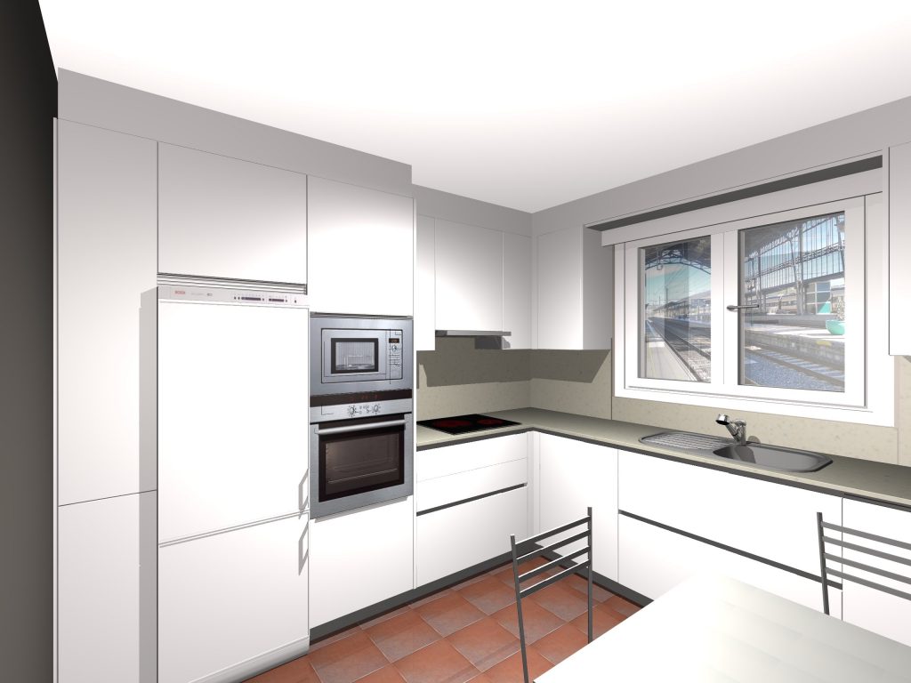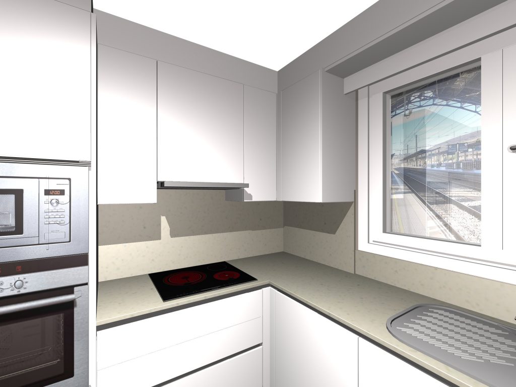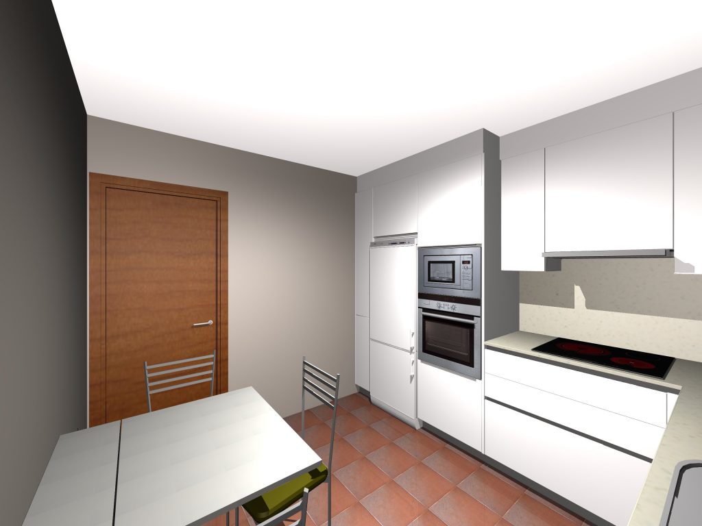 - Necesidades y solicitudes cliente: Escobero, muebles colgantes, mesa plegable, (pequeña, para usos varios) fregadero inoxidable sobre encimera con escurreplatos, y utilizar frigorífico combinado actual.